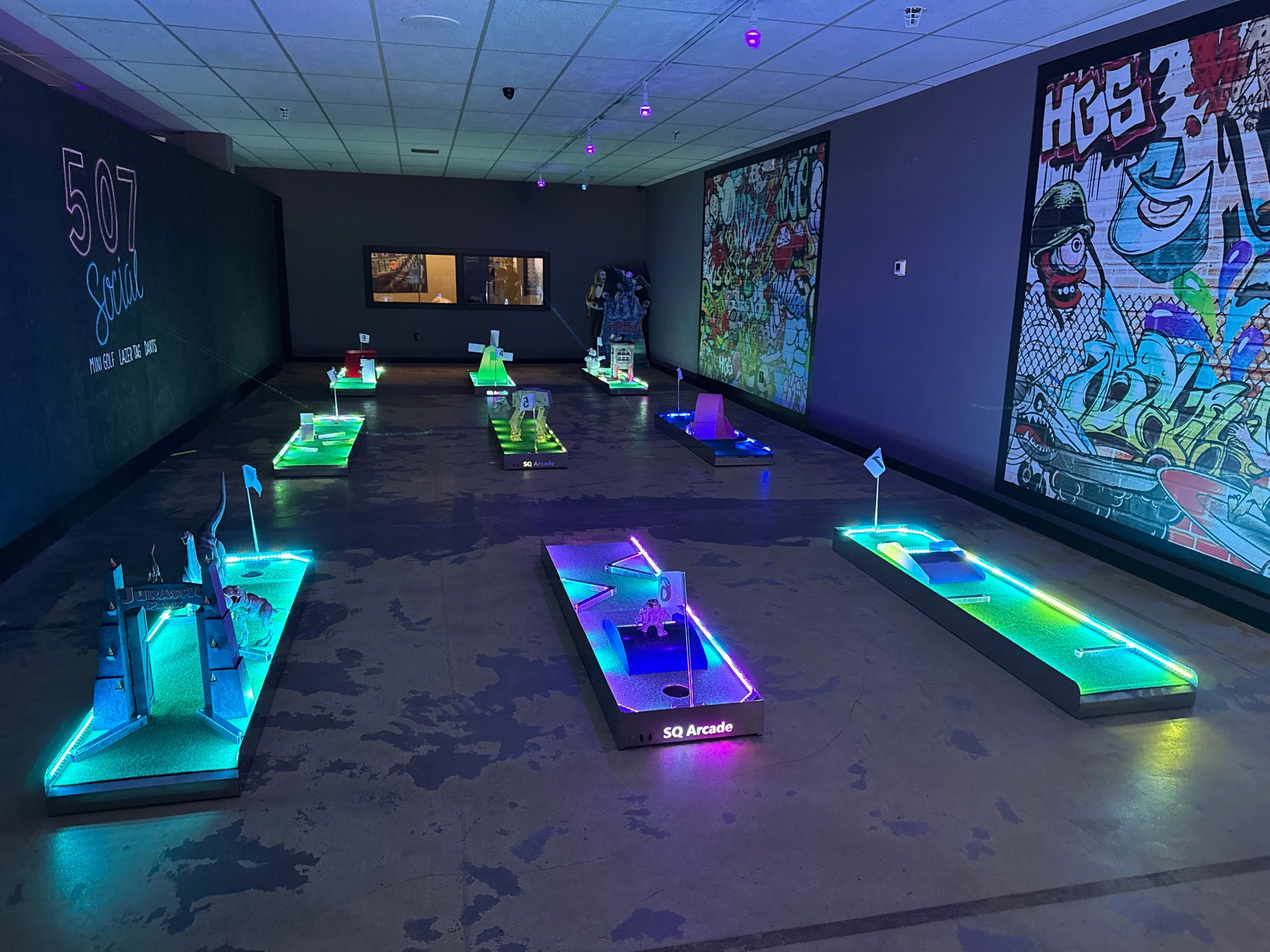 Immerse yourself in our 9 hole Mini Golf course featuring Pop Culture themed holes, LED Lite holes, and Glow balls. It's Fun for everyone.